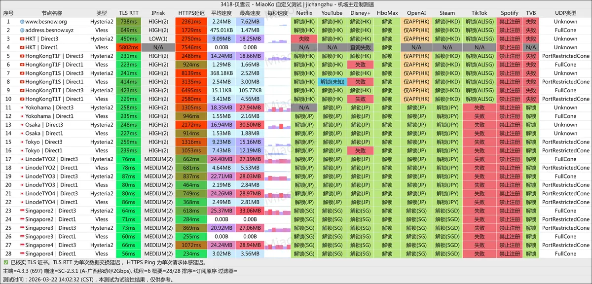 | TikTok 解锁能力薄弱 | 日本与新加坡节点 TikTok 全线失败,仅极少数香港节点显示 ALISG 解锁,覆盖极为有限 |