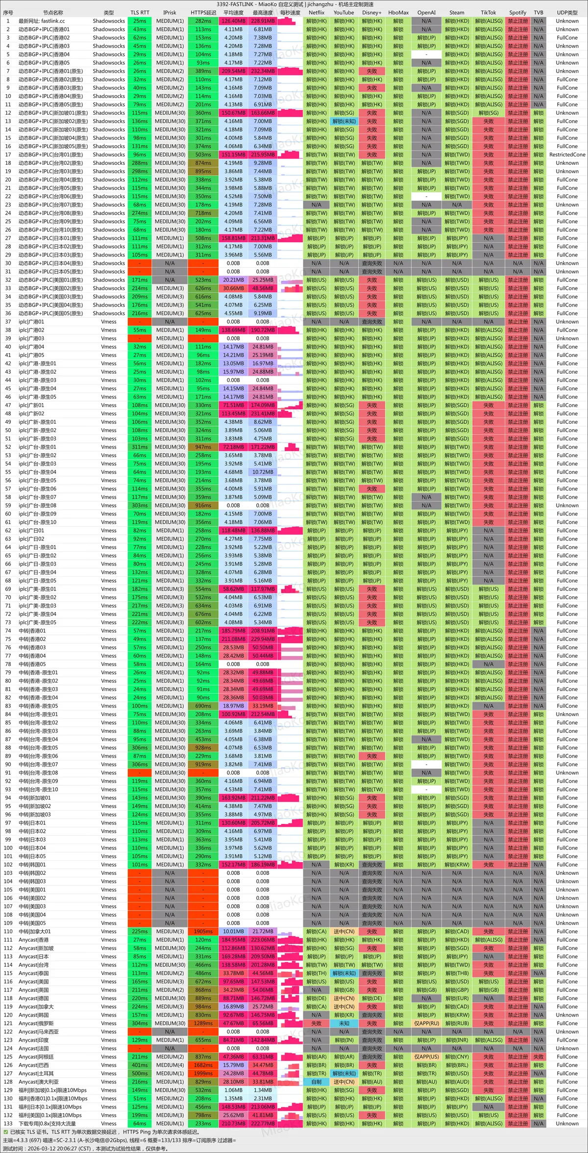 测速环境: 长沙电信 @ 千兆宽带 | 测试工具: MiaoKo 喵速自定义测试 | 套餐: 动态BGP+IPLC · 基础套餐 | 测试时间: 2026年3月12日