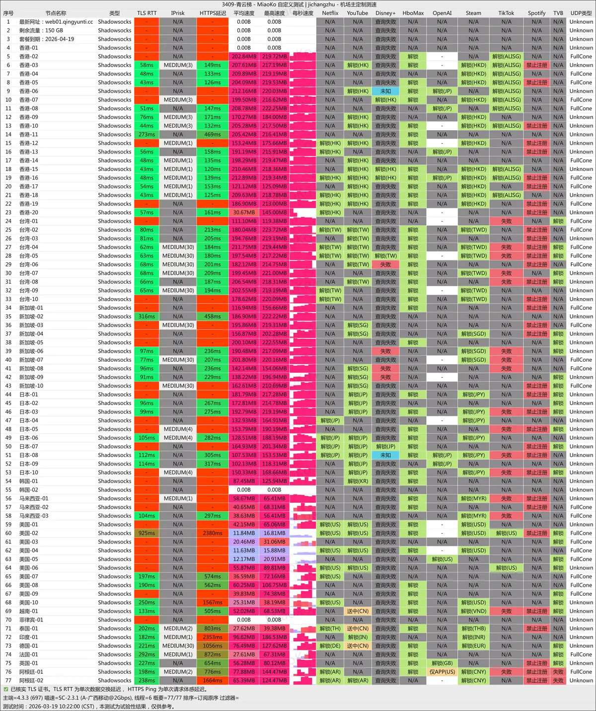 本次测试共覆盖 77 个节点,分布于香港、台湾、新加坡、日本、韩国、马来西亚、美国、越南、菲律宾、泰国、印度、德国、法国、英国、阿根廷等地区,节点覆盖面较广。亚太地区节点(香港、台湾、新加坡)整体速度表现突出,多数节点平均速度集中在 180–210 MB/s 区间,峰值可超 220 MB/s;欧美节点速度明显偏低,部分节点存在超时或查询失败情况。延迟方面,香港节点表现最优,多数在 40–80ms 之间,欧美节点延迟普遍超过 200ms。流媒体解锁方面,各平台表现分化明显,Netflix、YouTube 在部分亚太节点可正常解锁,OpenAI 仅少数节点支持,TikTok 实测多数节点显示禁止注册或失败,与官方宣传存在明显落差。