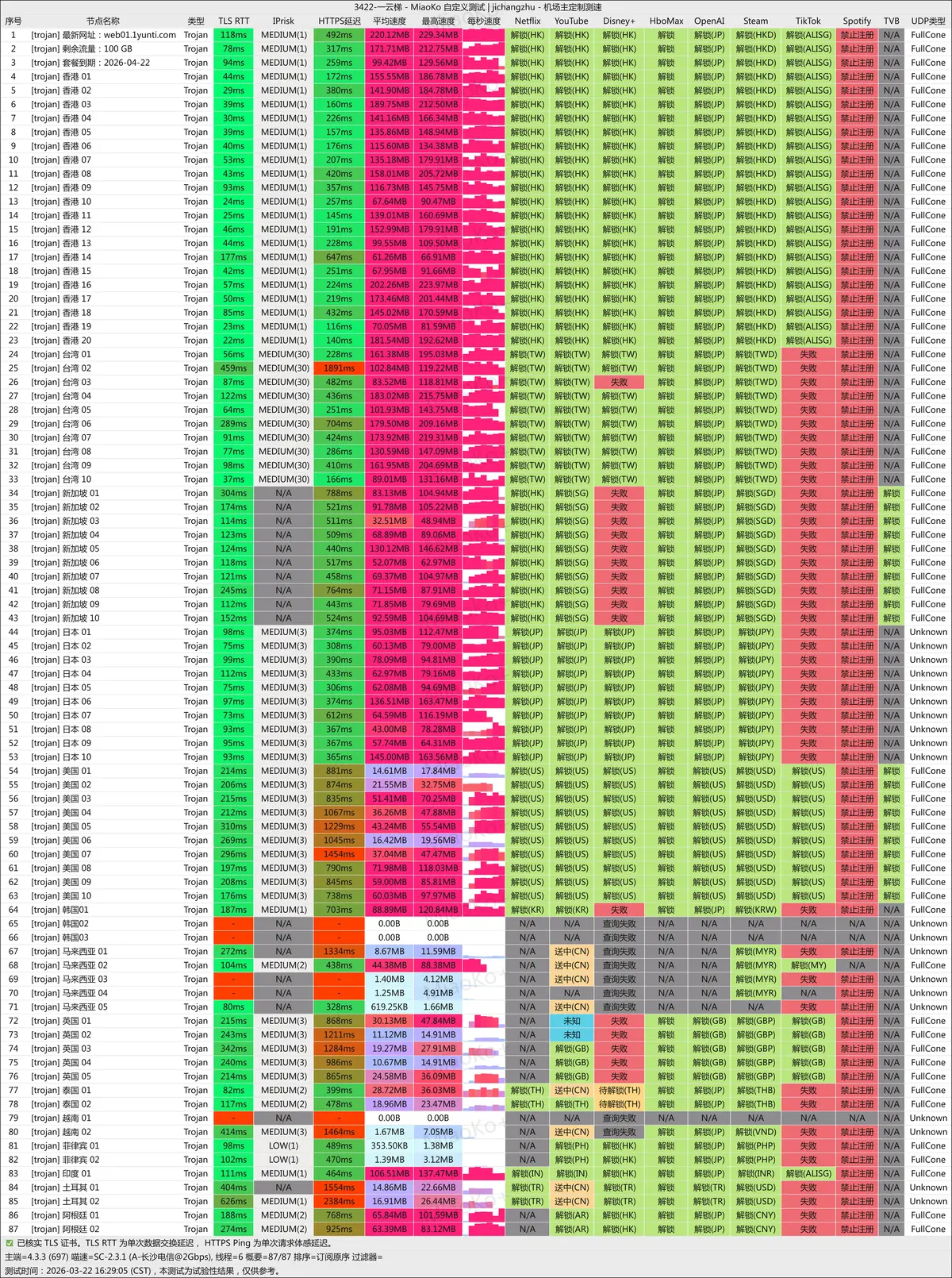 | 部分节点连接失败 | 韩国02/03、马来西亚03/04、越南01 共计 5 个节点测试失败,速度显示为 0,可用性存在缺口 |