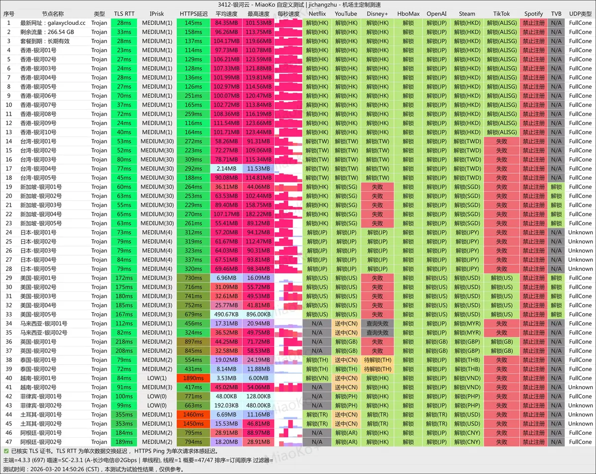本次测试共覆盖香港、台湾、新加坡、日本、美国、马来西亚、英国、泰国、越南、菲律宾、土耳其、阿根廷共 12 个地区、47 个节点,全部采用 Trojan 协议。香港节点在速度与延迟两项指标上均表现突出,普遍超过 100Mbps,TLS RTT 低至 23ms,是本次测试中综合表现最强的地区。延迟方面,东南亚部分节点(越南、菲律宾)及土耳其节点表现欠佳,HTTPS 延迟存在超过 1000ms 的情况。流媒体解锁方面,Netflix 与 YouTube 覆盖面较广,但 TikTok 全线基本失败,Spotify 普遍显示禁止注册,有相关需求的用户需注意。