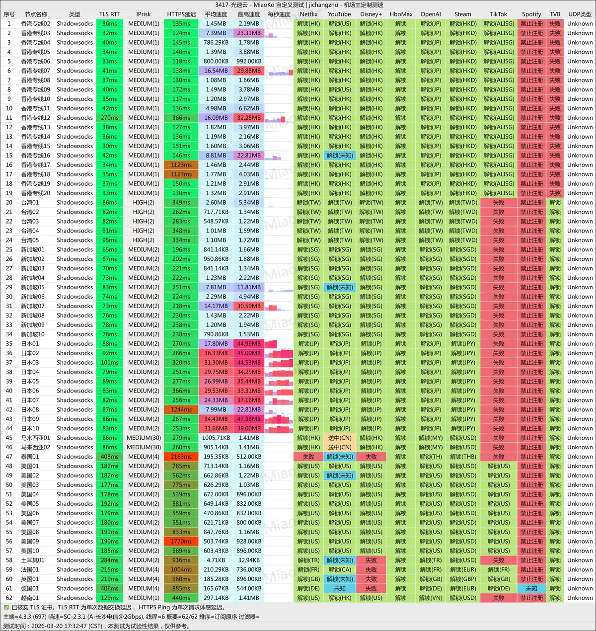 本次测试共覆盖 62 个 Shadowsocks 节点,分布于香港、台湾、新加坡、日本、马来西亚、泰国、美国、土耳其、法国、英国、德国、越南等 12 个地区。速度方面,日本节点表现突出,峰值可达 47MB/s 左右,而欧美及东南亚部分节点速度偏低,整体速度分化明显。延迟方面,香港节点 TLS 延迟集中在 30–40ms,表现优异,美国及欧洲节点延迟普遍超过 180ms。流媒体解锁覆盖主流平台,但 Spotify 全线显示”禁止注册”,TikTok 在台湾、新加坡、日本节点上普遍失败,有相关需求的用户需注意。
